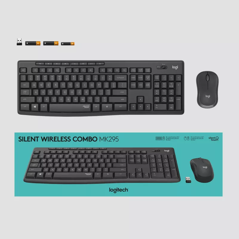 - LOGITECH MK295 SILENT WIRELESS COMBO. KEYBOARD FORM FACTOR: FULL-SIZE (100%). KEYBOARD STYLE: STRAIGHT. CONNECTIVITY TECHNOLOGY: WIRED, DEVICE INTERFACE: RF WIRELESS, KEYBOARD LAYOUT: QWERTY, RECOMMENDED USAGE: OFFICE. PRODUCT COLOUR: GRAPHITE. MOUSE INCL