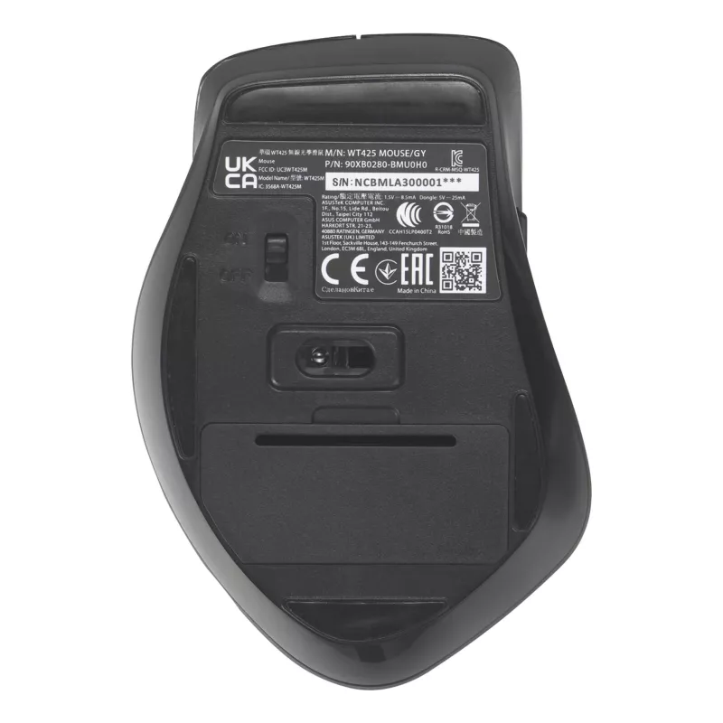 - ASUS WT425. FORM FACTOR: RIGHT-HAND. MOVEMENT DETECTION TECHNOLOGY: OPTICAL, DEVICE INTERFACE: RF WIRELESS, MOVEMENT RESOLUTION: 1600 DPI, BUTTONS TYPE: PRESSED BUTTONS, BUTTONS QUANTITY: 6, SCROLL TYPE: WHEEL. POWER SOURCE: BATTERIES. PRODUCT COLOUR: BLA
