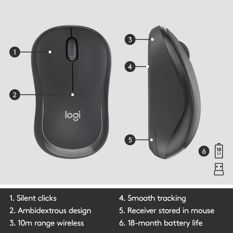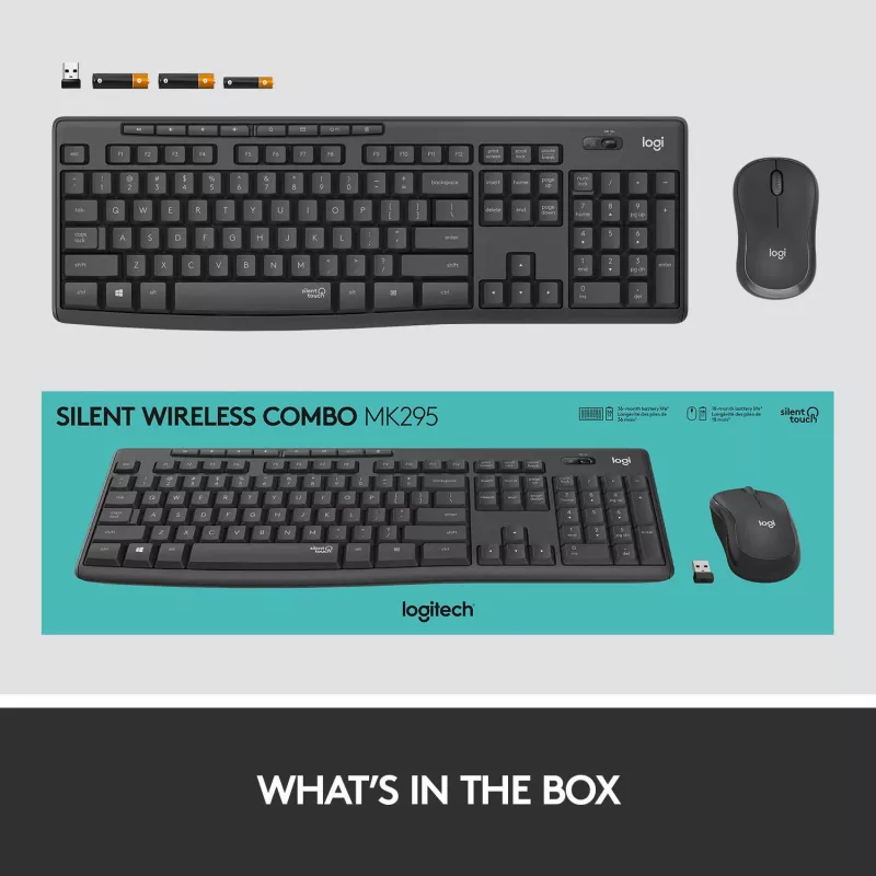 - LOGITECH MK295 SILENT WIRELESS COMBO. KEYBOARD FORM FACTOR: FULL-SIZE (100%). KEYBOARD STYLE: STRAIGHT. CONNECTIVITY TECHNOLOGY: WIRED, DEVICE INTERFACE: RF WIRELESS, KEYBOARD LAYOUT: QWERTY, RECOMMENDED USAGE: OFFICE. PRODUCT COLOUR: GRAPHITE. MOUSE INCL