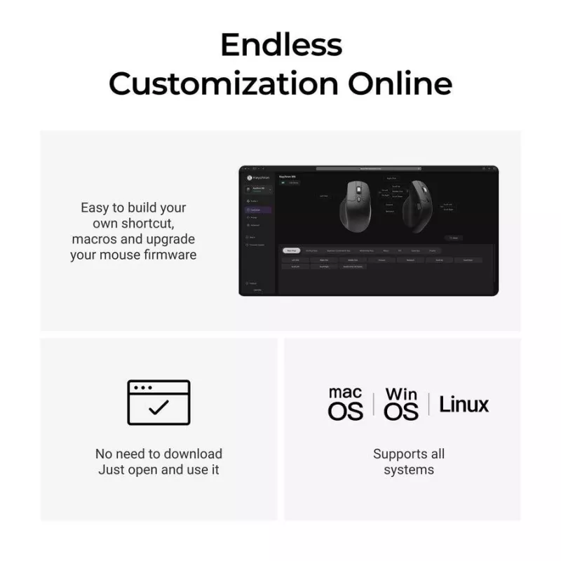 - KEYCHRON M6. FORM FACTOR: RIGHT-HAND. MOVEMENT DETECTION TECHNOLOGY: OPTICAL, DEVICE INTERFACE: RF WIRELESS + BLUETOOTH + USB TYPE-C, MOVEMENT RESOLUTION: 30000 DPI, BUTTONS TYPE: PRESSED BUTTONS, SCROLL TYPE: WHEEL. POWER SOURCE: BATTERIES/CABLE. PRODUCT
