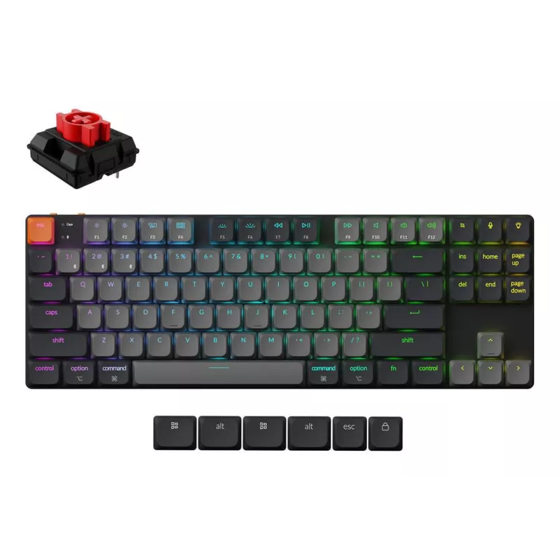 - KEYCHRON K1X-B1. KEYBOARD FORM FACTOR: 80%. KEYBOARD STYLE: STRAIGHT. CONNECTIVITY TECHNOLOGY: WIRED & WIRELESS, DEVICE INTERFACE: USB + BLUETOOTH, KEYBOARD KEY SWITCH: MECHANICAL, KEYBOARD LAYOUT: QWERTY, KEYBOARD NUMBER OF KEYS: 87. BACKLIGHT TYPE: RGB