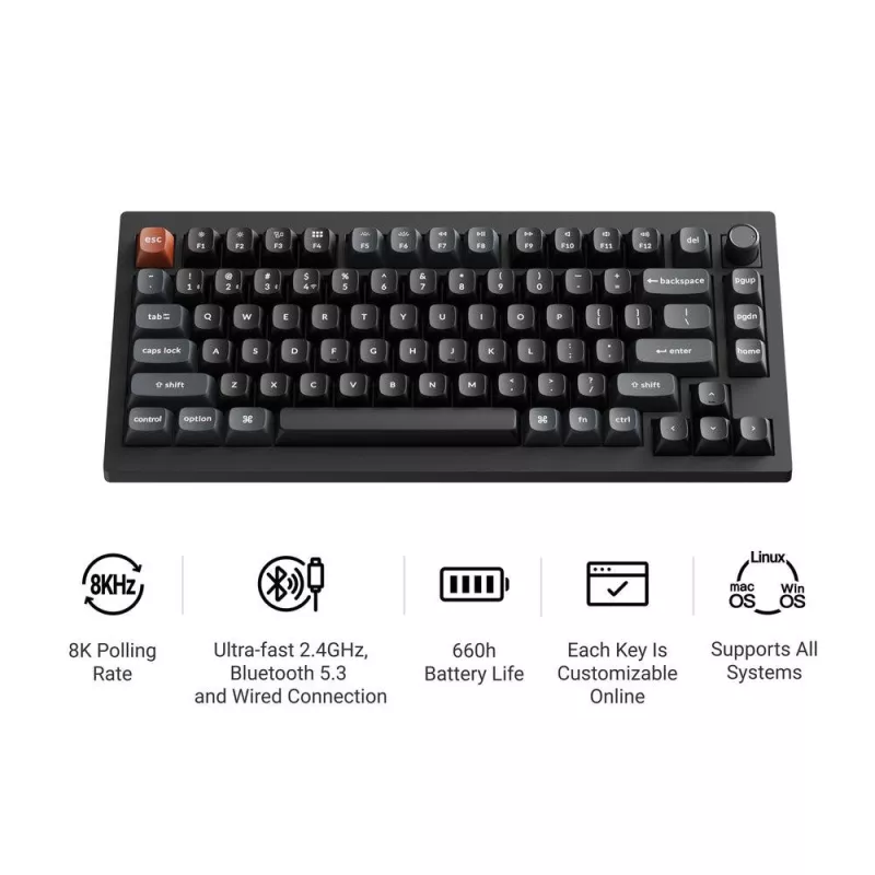Wired & Wireless , Bluetooth , Form factor 75% , Bluetooth version 5.3 , Backlight Yes , Backlight colour Multicolour , Colour Black , USB connector type USB Type-C , Power source type Battery,USB , Battery life (max) 660 h