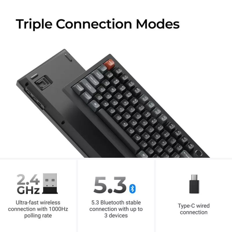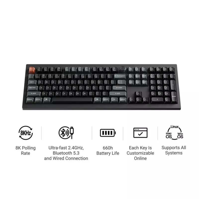 - KEYCHRON V6 ULTRA 8K. KEYBOARD FORM FACTOR: FULL-SIZE (100%). KEYBOARD STYLE: STRAIGHT. CONNECTIVITY TECHNOLOGY: WIRED & WIRELESS, DEVICE INTERFACE: BLUETOOTH, KEYBOARD KEY SWITCH: MECHANICAL, KEYBOARD LAYOUT: QWERTY. BACKLIGHT TYPE: RGB LED. RECOMMENDED
