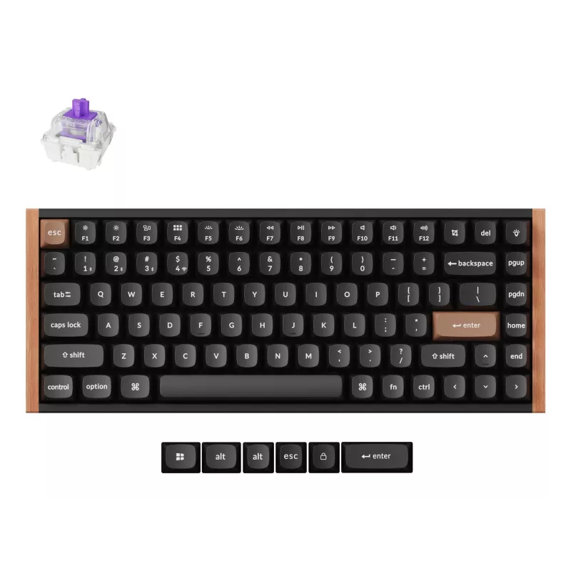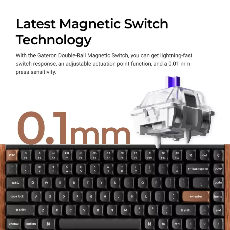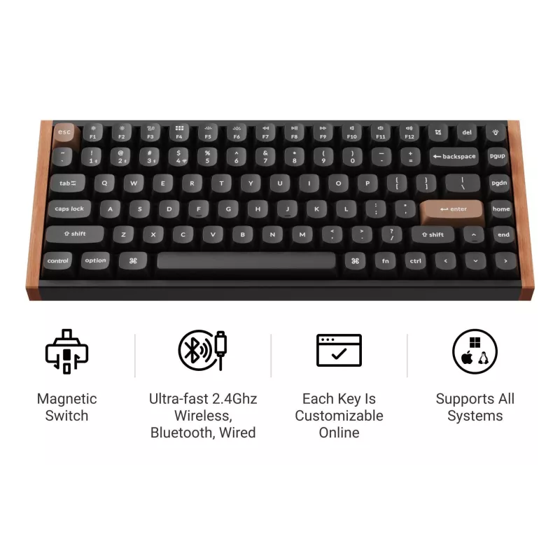 - KEYCHRON K2 HE. KEYBOARD FORM FACTOR: 75%, CONNECTIVITY TECHNOLOGY: WIRED & WIRELESS, DEVICE INTERFACE: USB + RF WIRELESS + BLUETOOTH, KEYBOARD KEY SWITCH: MAGNETIC-MECHANICAL KEY SWITCH, KEYBOARD LAYOUT: QWERTY. BACKLIGHT TYPE: RGB LED. RECOMMENDED USAGE