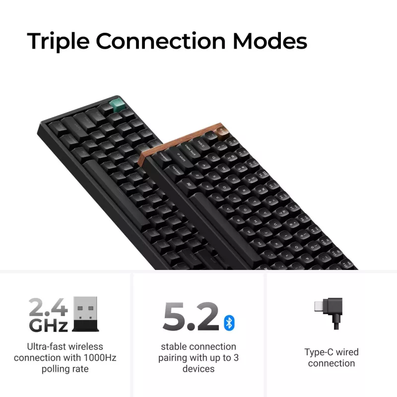 Wired & Wireless , USB + RF Wireless + Bluetooth , Form factor 75% , Bluetooth version 5.2 , KB language ENG , Backlight Yes , Backlight colour Multicolour , Colour Black , USB connector type USB Type-C , Power source type Battery , Battery life (max) 110 h , USB Type-C charging port Yes