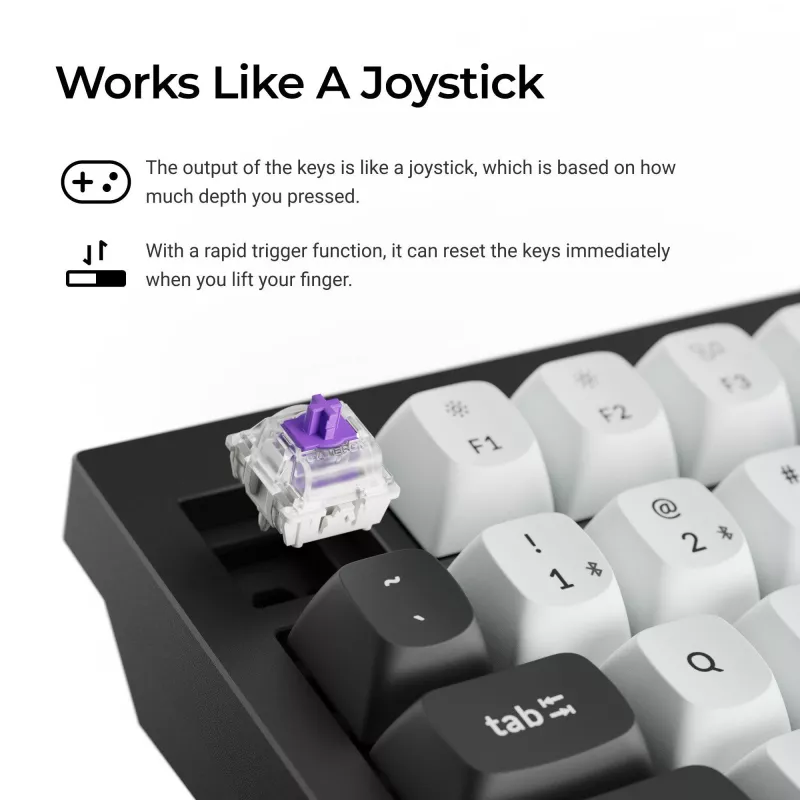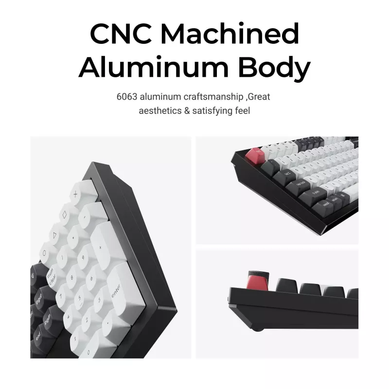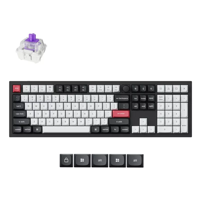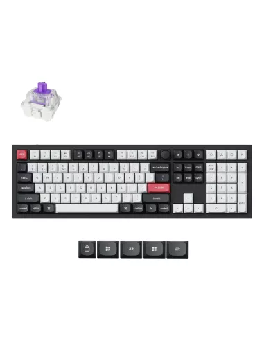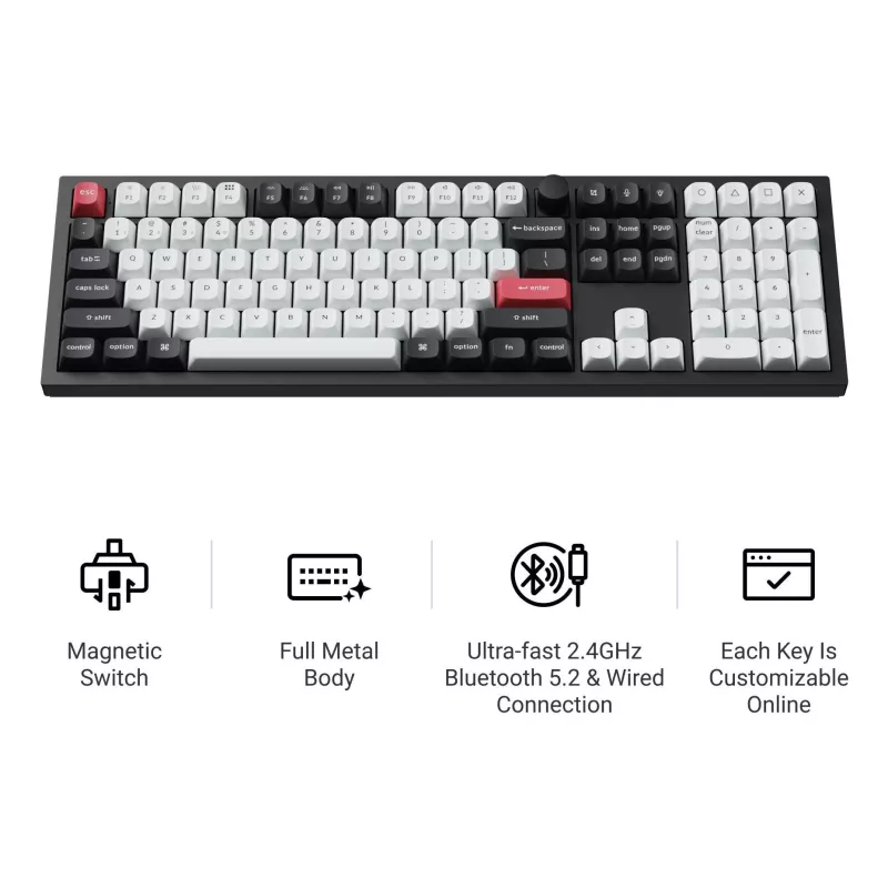 - KEYCHRON Q6 HE QMK. KEYBOARD FORM FACTOR: FULL-SIZE (100%), CONNECTIVITY TECHNOLOGY: WIRED & WIRELESS, DEVICE INTERFACE: USB + RF WIRELESS + BLUETOOTH, KEYBOARD KEY SWITCH: MAGNETIC-MECHANICAL KEY SWITCH, KEYBOARD LAYOUT: QWERTY. BACKLIGHT TYPE: RGB LED.
