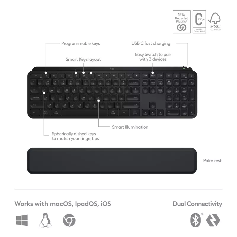 - LOGITECH MASTER MX KEYS S COMBO. KEYBOARD FORM FACTOR: FULL-SIZE (100%). KEYBOARD STYLE: STRAIGHT. CONNECTIVITY TECHNOLOGY: WIRELESS, DEVICE INTERFACE: BLUETOOTH, KEYBOARD KEY SWITCH: SCISSOR KEY SWITCH, KEYBOARD LAYOUT: QWERTY. BACKLIGHT TYPE: LED, WRIST