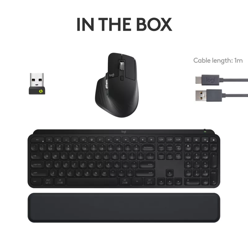 - KEYBOARD MX KEYS S COMBO MOUSE PALMREST LOGI BOLT USB RECEIVER USB-A TO USB-C CHARGING CABLE USER DOCUMENTATION
