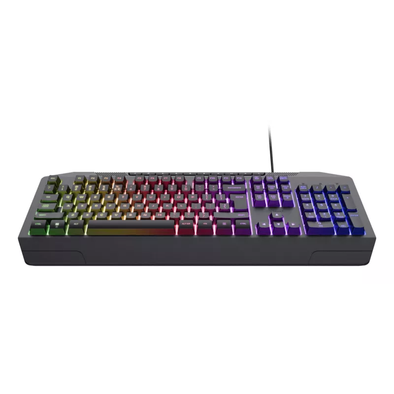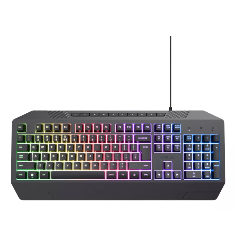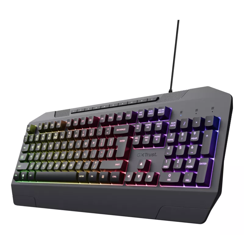 - TRUST GXT 836 EVOCX. KEYBOARD FORM FACTOR: 110%. KEYBOARD STYLE: STRAIGHT. CONNECTIVITY TECHNOLOGY: WIRED, DEVICE INTERFACE: USB, KEYBOARD KEY SWITCH: MEMBRANE, KEYBOARD LAYOUT: QWERTY, KEYBOARD NUMBER OF KEYS: 114. BACKLIGHT TYPE: RGB LED, WRIST REST. RE
