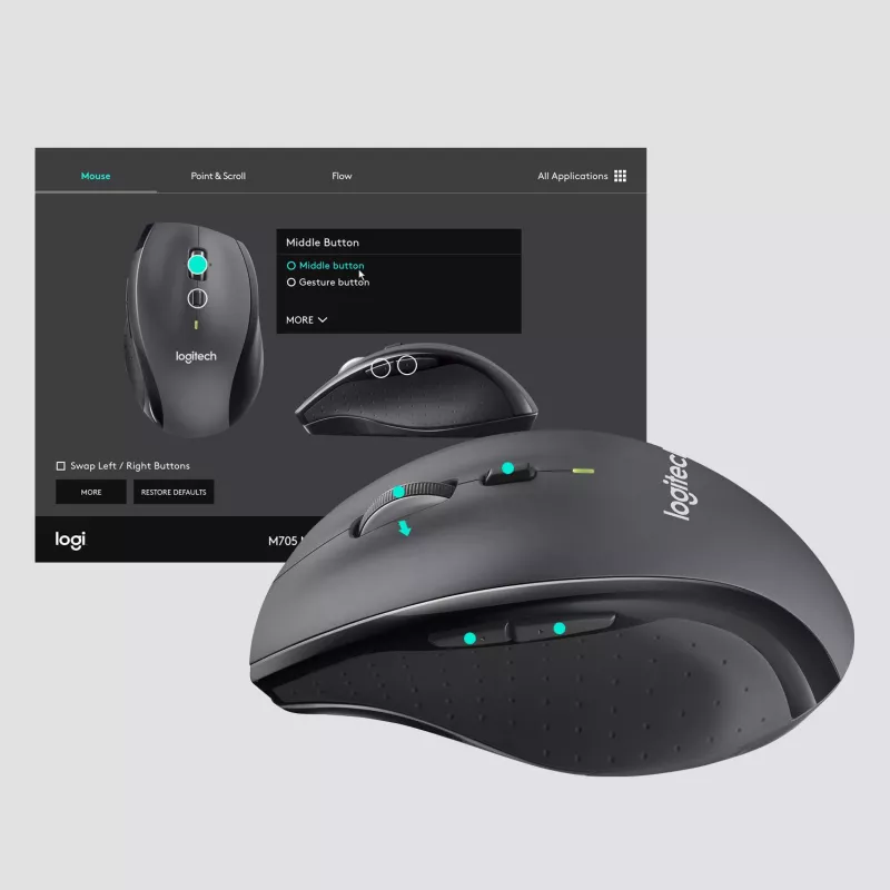 - LOGITECH MARATHON MOUSE M705. FORM FACTOR: RIGHT-HAND. MOVEMENT DETECTION TECHNOLOGY: OPTICAL, DEVICE INTERFACE: RF WIRELESS, MOVEMENT RESOLUTION: 1000 DPI, BUTTONS TYPE: PRESSED BUTTONS, BUTTONS QUANTITY: 5, SCROLL TYPE: WHEEL. POWER SOURCE: BATTERIES. P