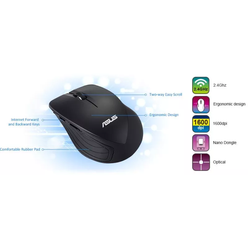 - ASUS WT465. FORM FACTOR: RIGHT-HAND. MOVEMENT DETECTION TECHNOLOGY: OPTICAL, DEVICE INTERFACE: RF WIRELESS, MOVEMENT RESOLUTION: 1600 DPI, BUTTONS TYPE: PRESSED BUTTONS, BUTTONS QUANTITY: 5, SCROLL TYPE: WHEEL. POWER SOURCE: BATTERIES. PRODUCT COLOUR: BLA