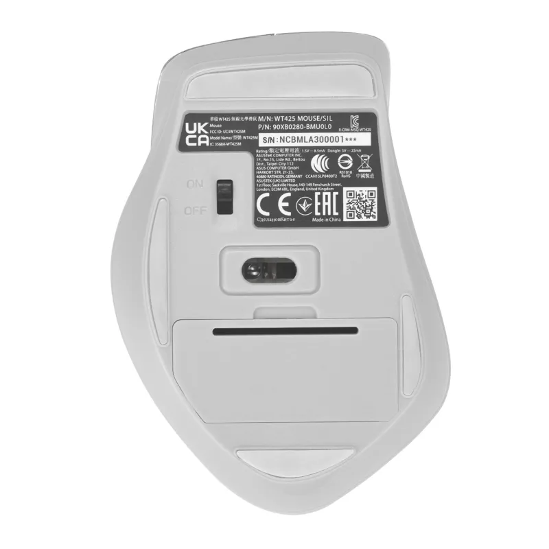 - ASUS WT425. FORM FACTOR: RIGHT-HAND. MOVEMENT DETECTION TECHNOLOGY: OPTICAL, DEVICE INTERFACE: RF WIRELESS, MOVEMENT RESOLUTION: 1600 DPI, SCROLL TYPE: WHEEL. POWER SOURCE: BATTERIES. PRODUCT COLOUR: SILVER