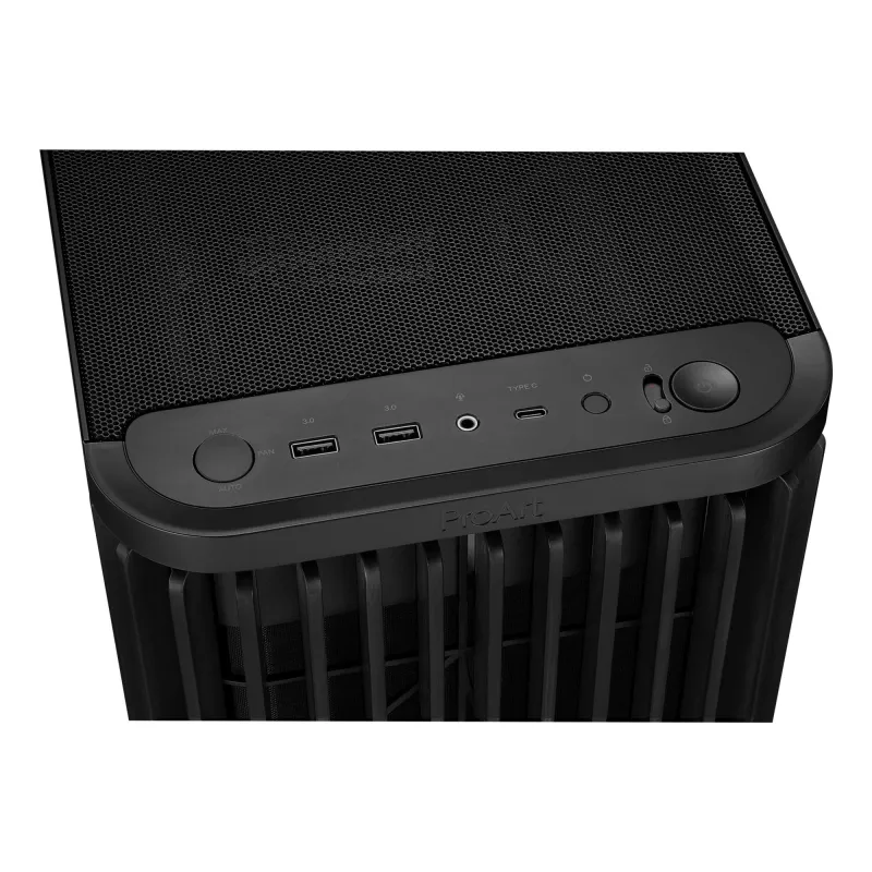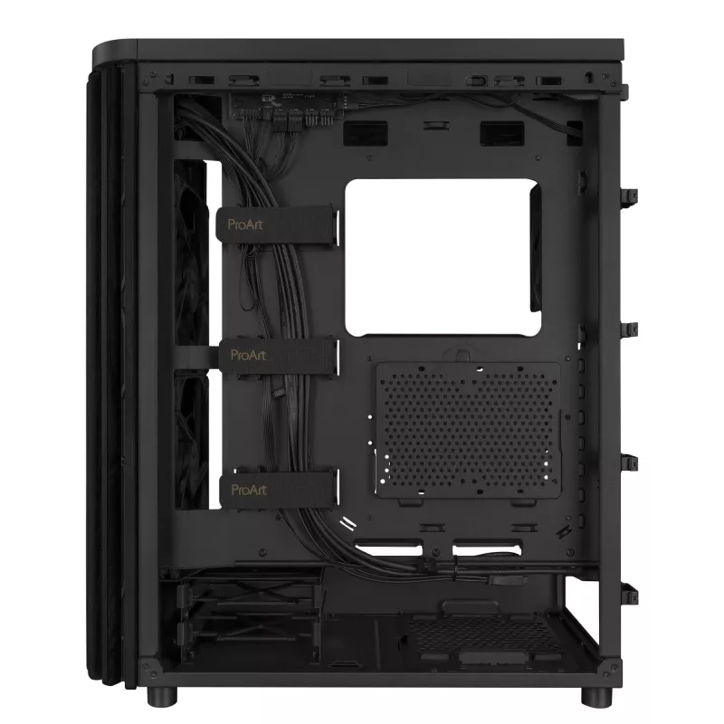 - ASUS PROART PA401 WOOD TG PWM (BLACK). FORM FACTOR: TOWER, TYPE: PC, PRODUCT COLOUR: BLACK. FRONT FANS INSTALLED: 2X 160 MM, FRONT FANS DIAMETERS SUPPORTED: 140,160 MM, REAR FANS DIAMETERS SUPPORTED: 120 MM. SUPPORTED HDD SIZES: 2.5,3.5". WIDTH: 225 MM, D