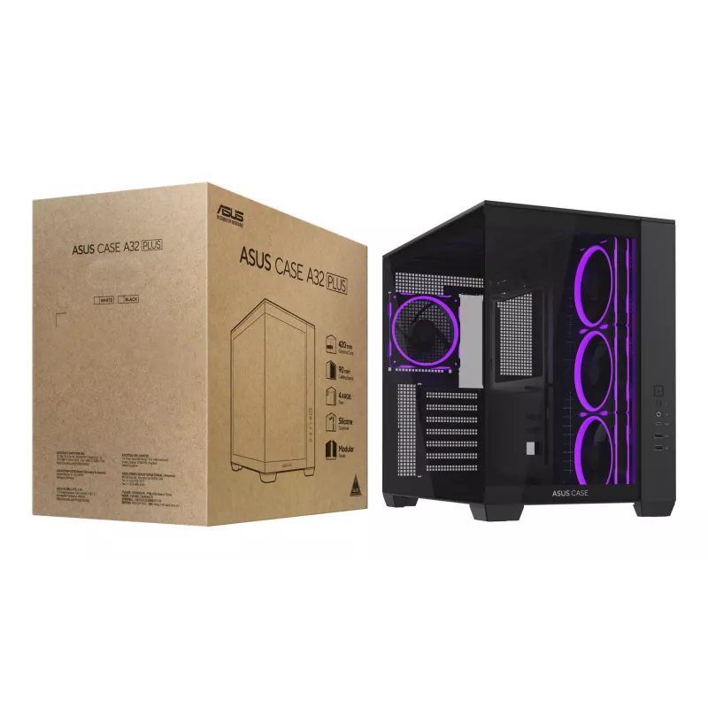 - ASUS A32 PLUS. TYPE: PC, PRODUCT COLOUR: BLACK, SUPPORTED MOTHERBOARD FORM FACTORS: ATX, MICRO ATX, MINI-ITX. SUPPORTED POWER SUPPLY FORM FACTORS: ATX. SIDE FANS INSTALLED: 3X 120 MM, SIDE FANS DIAMETERS SUPPORTED: 120 MM, REAR FANS INSTALLED: 1X 120 MM.