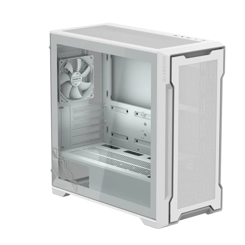 - GIGABYTE C102 GLASS. FORM FACTOR: MIDI TOWER, TYPE: PC, PRODUCT COLOUR: WHITE. POWER SUPPLY LOCATION: BOTTOM, SUPPORTED POWER SUPPLY FORM FACTORS: ATX. FRONT FANS INSTALLED: 1X 120 MM, FRONT FANS DIAMETERS SUPPORTED: 120,140 MM, SIDE FANS DIAMETERS SUPPOR