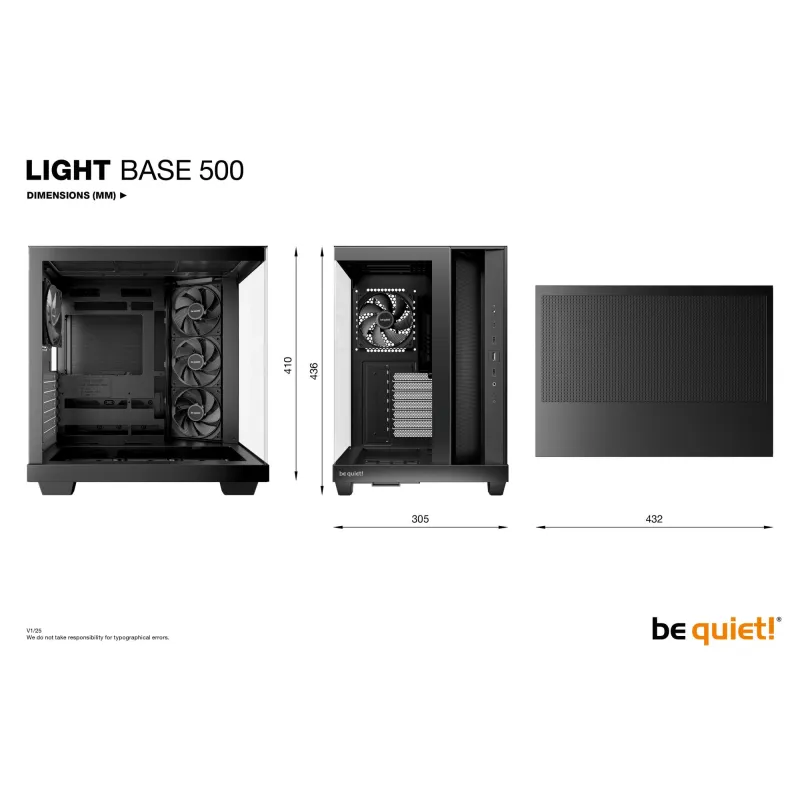 - BE QUIET! LIGHT BASE 500. FORM FACTOR: MIDI TOWER, TYPE: PC, PRODUCT COLOUR: BLACK. SUPPORTED POWER SUPPLY FORM FACTORS: ATX, PS2. SIDE FANS INSTALLED: 3X 120 MM, SIDE FANS DIAMETERS SUPPORTED: 120 MM, REAR FANS INSTALLED: 1X 120 MM. SUPPORTED HDD SIZES: