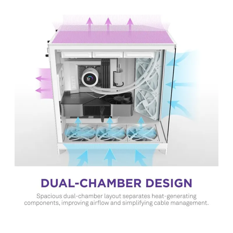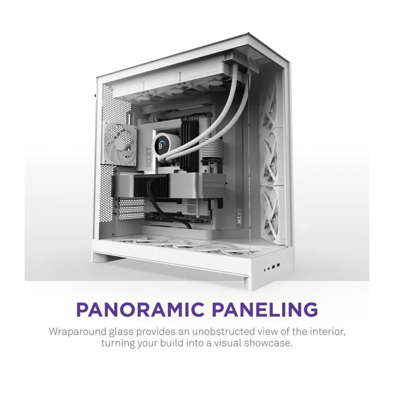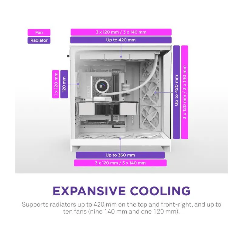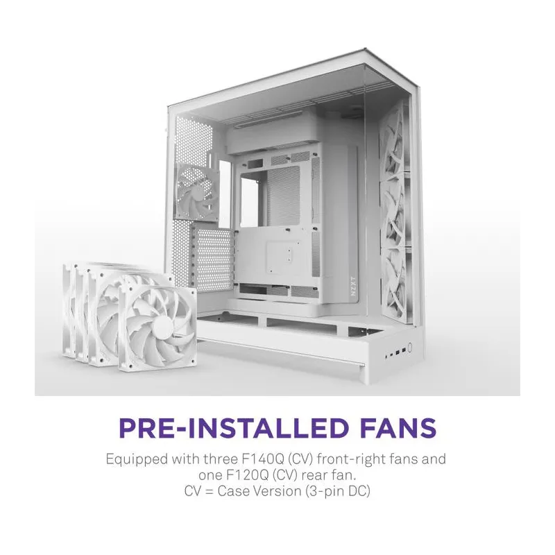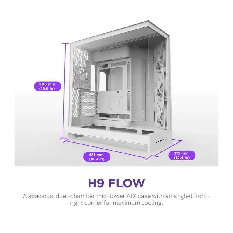 NZXT H9 FLOW. FORM FACTOR: MIDI TOWER, TYPE: PC, PRODUCT COLOUR: WHITE. FRONT FANS INSTALLED: 3X 140 MM, FRONT FANS DIAMETERS SUPPORTED: 120,140 MM, REAR FANS INSTALLED: 1X 120 MM. SUPPORTED HDD SIZES: 2.5,3.5" . WIDTH: 315 MM, DEPTH: 481 MM, HEIGHT: