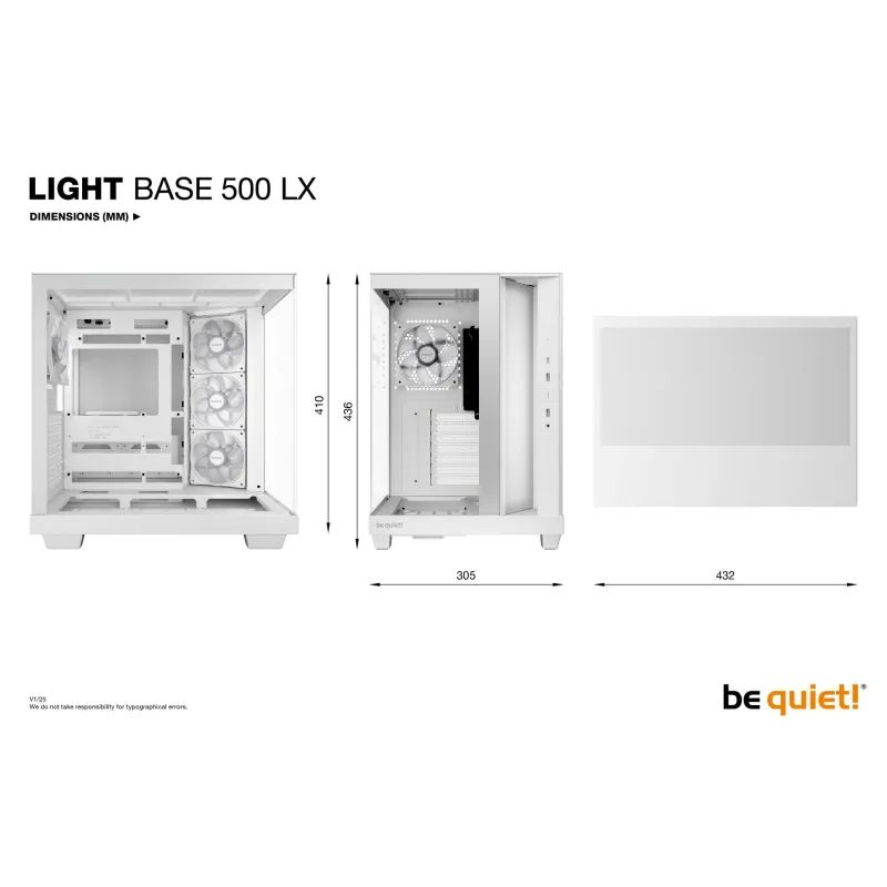 - BE QUIET! LIGHT BASE 500 LX WHITE. FORM FACTOR: MIDI TOWER, TYPE: PC, PRODUCT COLOUR: WHITE. SUPPORTED POWER SUPPLY FORM FACTORS: ATX, PS2. SIDE FANS INSTALLED: 3X 120 MM, SIDE FANS DIAMETERS SUPPORTED: 120 MM, REAR FANS INSTALLED: 1X 120 MM. SUPPORTED HD