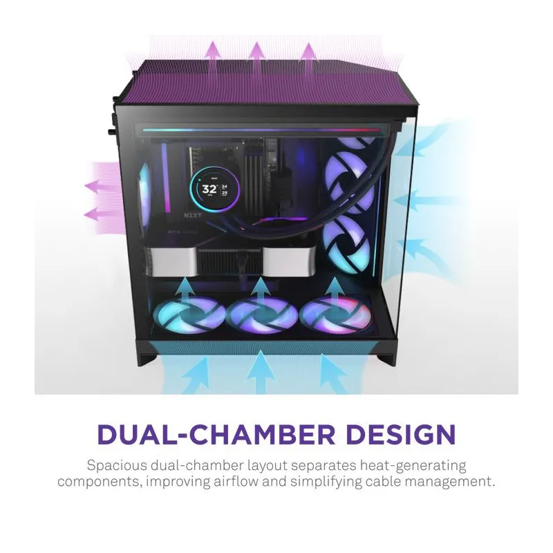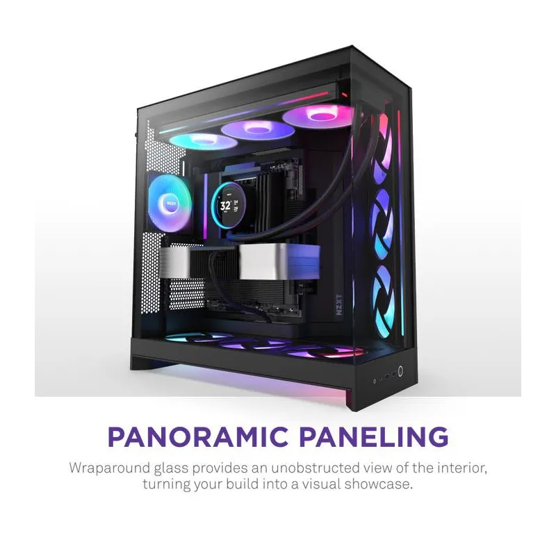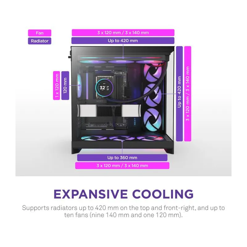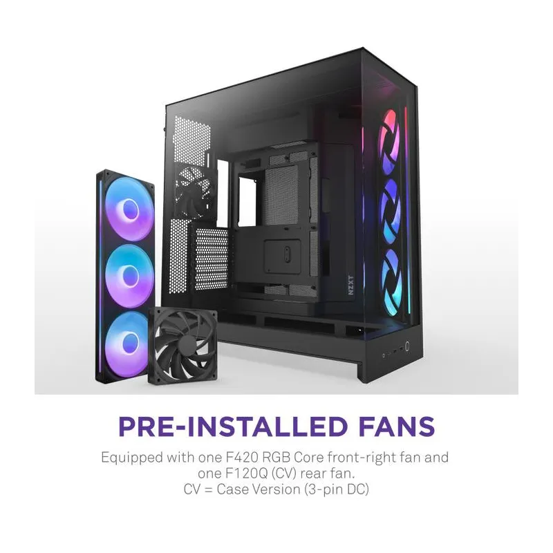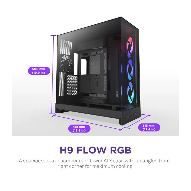 - NZXT H9 FLOW RGB. FORM FACTOR: MIDI TOWER, TYPE: PC, PRODUCT COLOUR: BLACK. FRONT FANS INSTALLED: 3X 140 MM, FRONT FANS DIAMETERS SUPPORTED: 120,140 MM, REAR FANS INSTALLED: 1X 120 MM. SUPPORTED HDD SIZES: 2.5,3.5" . WIDTH: 315 MM, DEPTH: 481 MM, HEIG