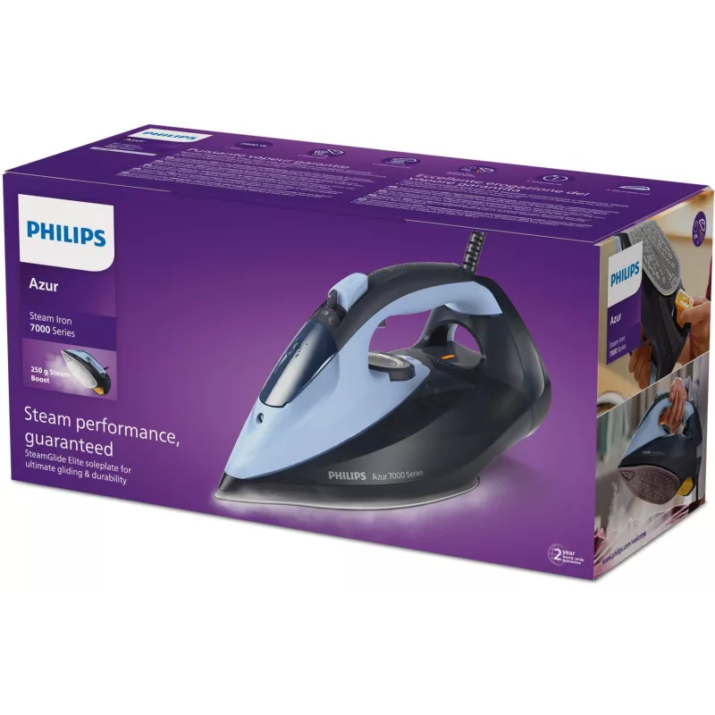 - PHILIPS 7000 SERIES DST7041/20 HV STEAM IRON LIGHT/DARK BLUE. TYPE: DRY & STEAM IRON, SOLEPLATE TYPE: STEAMGLIDE ELITE SOLEPLATE, CORD LENGTH: 2 M. IRON POWER: 2800 W, MAXIMUM POWER: 2800 W, AC INPUT VOLTAGE: 220-240 V. PACKAGE TYPE: BOX. WARRANTY PERIOD: