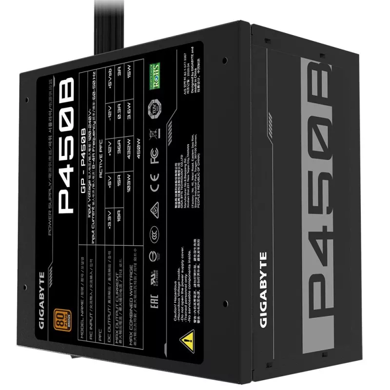 - GIGABYTE P450B. TOTAL POWER: 450 W, AC INPUT VOLTAGE: 100 - 240 V, AC INPUT FREQUENCY: 50 - 60 HZ. MOTHERBOARD POWER CONNECTOR: 20+4 PIN ATX, MOTHERBOARD POWER CABLE LENGTH: 55 CM, SATA POWER CABLE LENGTH: 500 MM. PURPOSE: PC, POWER SUPPLY UNIT (PSU) FORM