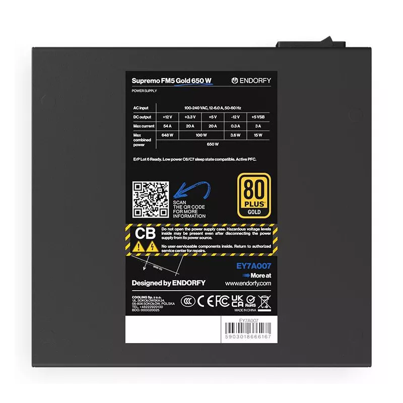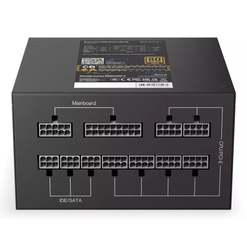 - ENDORFY SUPREMO FM5. TOTAL POWER: 650 W, AC INPUT VOLTAGE: 115 - 230 V, AC INPUT FREQUENCY: 50/60 HZ. MOTHERBOARD POWER CONNECTOR: 18+10 PIN ATX, CABLING TYPE: FULLY-MODULAR. PURPOSE: PC, POWER SUPPLY UNIT (PSU) FORM FACTOR: ATX, 80 PLUS CERTIFICATION: 80