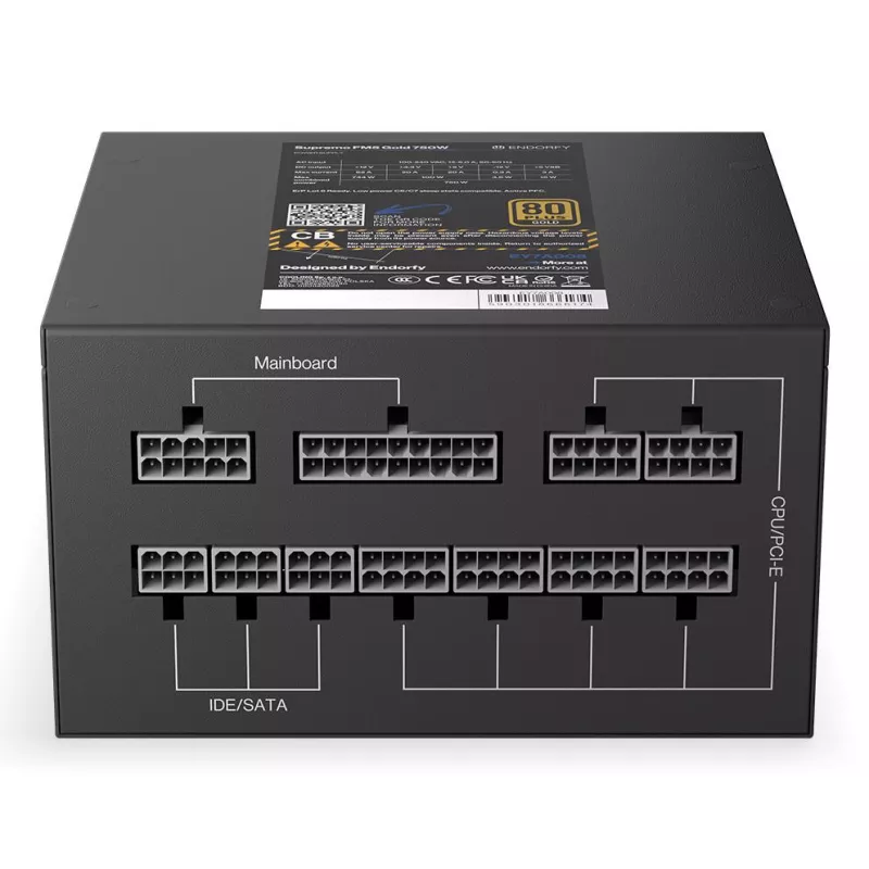 - ENDORFY SUPREMO FM5 GOLD 750 W. TOTAL POWER: 750 W, AC INPUT VOLTAGE: 115 - 230 V, COMBINED POWER (+3.3V): 100 W. MOTHERBOARD POWER CONNECTOR: 18+10 PIN ATX, CABLING TYPE: FULLY-MODULAR. PURPOSE: PC, POWER SUPPLY UNIT (PSU) FORM FACTOR: ATX, 80 PLUS CERTI