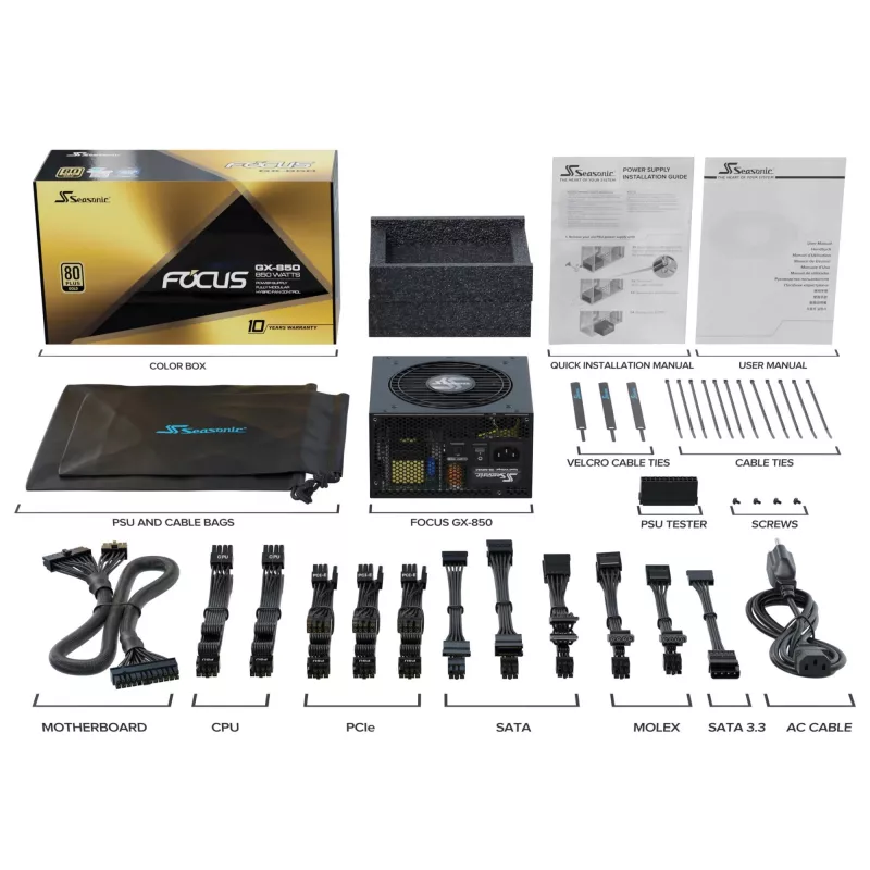 - SEASONIC FOCUS GX. TOTAL POWER: 850 W, AC INPUT VOLTAGE: 100 - 240 V, AC INPUT FREQUENCY: 50/60 HZ. MOTHERBOARD POWER CONNECTOR: 20+4 PIN ATX, MOTHERBOARD POWER CABLE LENGTH: 61 CM, SATA POWER CABLE LENGTH: 450,810,860 MM. PURPOSE: PC, POWER SUPPLY UNIT (