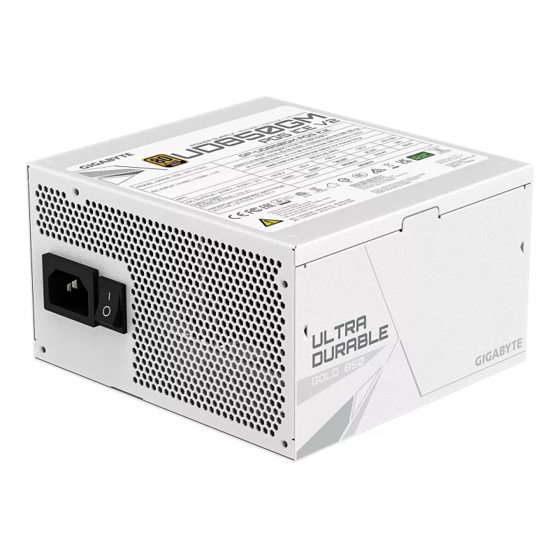 - GIGABYTE UD850GM PG5 V2 ICE POWER SUPPLY UNIT- PCIE GEN 5.1, 80 PLUS GOLD, FULLY MODULAR DESIGN, 120MM FAN, ATX 3.1 COMPATIBLE, UK PLUG. TOTAL POWER: 850 W, AC INPUT VOLTAGE: 100 - 240 V, AC INPUT FREQUENCY: 50/60 HZ. MOTHERBOARD POWER CONNECTOR: 20+4 PIN
