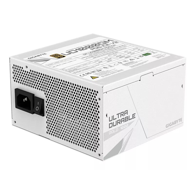 - GIGABYTE UD1000GM PG5 V2 ICE POWER SUPPLY UNIT- PCIE GEN 5.1, 80 PLUS GOLD, FULLY MODULAR DESIGN, 120MM FAN, ATX 3.1 COMPATIBLE, EU PLUG. TOTAL POWER: 1000 W, AC INPUT VOLTAGE: 100 - 240 V, AC INPUT FREQUENCY: 50/60 HZ. MOTHERBOARD POWER CONNECTOR: 20+4 P