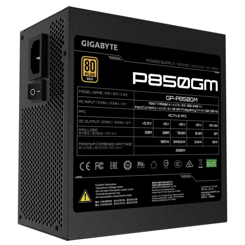 - GIGABYTE P850GM. TOTAL POWER: 850 W, AC INPUT VOLTAGE: 100 - 240 V, AC INPUT FREQUENCY: 50 - 60 HZ. MOTHERBOARD POWER CONNECTOR: 20+4 PIN ATX, MOTHERBOARD POWER CABLE LENGTH: 61 CM, SATA POWER CABLE LENGTH: 600,750,900 MM. PURPOSE: PC, POWER SUPPLY UNIT (