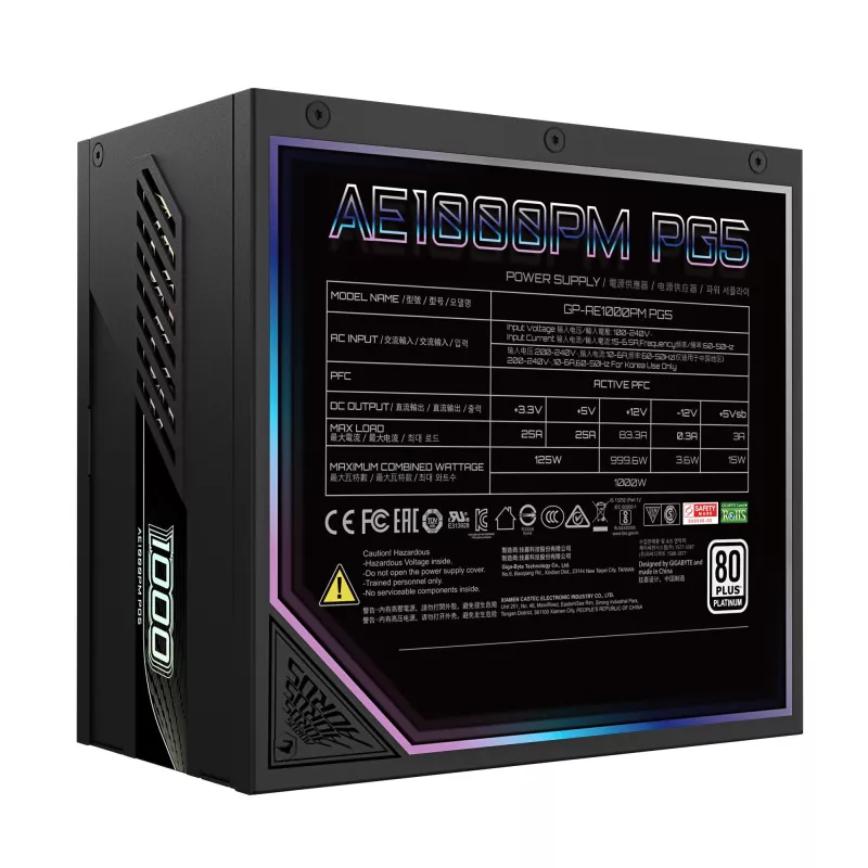 - GIGABYTE AORUS ELITE P1000W ICE POWER SUPPLY UNIT - PCIE 5.0, 80 PLUS PLATINUM, FULLY MODULAR DESIGN, 120MM FAN, ATX 3.0 COMPATIBLE, EU PLUG. TOTAL POWER: 1000 W, AC INPUT VOLTAGE: 100 - 240 V, AC INPUT FREQUENCY: 50/60 HZ. MOTHERBOARD POWER CONNECTOR: 20