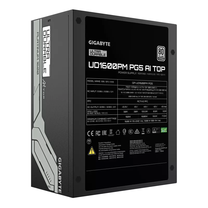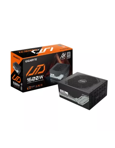 - GIGABYTE UD1600PM PG5 AI TOP POWER SUPPLY - PCIE 5.0, 80 PLUS PLATINUM, FULLY MODULAR DESIGN, 120MM FAN, ATX 3.1 COMPATIBLE, EU PLUG. TOTAL POWER: 1600 W, AC INPUT VOLTAGE: 100 - 240 V, AC INPUT FREQUENCY: 50/60 HZ. MOTHERBOARD POWER CONNECTOR: 20+4 PIN A