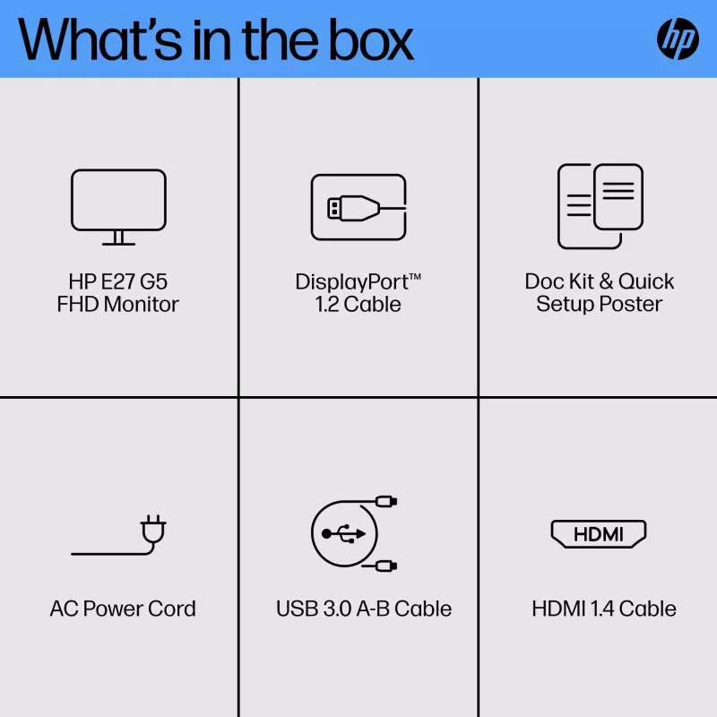 - HP E27 G5 FHD MONITOR. DISPLAY DIAGONAL: 68.6 CM (27"), DISPLAY RESOLUTION: 1920 X 1080 PIXELS, HD TYPE: FULL HD, DISPLAY TECHNOLOGY: LCD, DISPLAY SURFACE: MATT, RESPONSE TIME: 5 MS, NATIVE ASPECT RATIO: 16:9, VIEWING ANGLE, HORIZONTAL: 178 , VIEWING ANGL