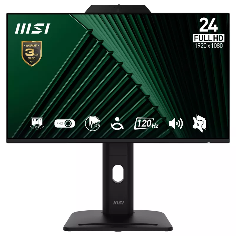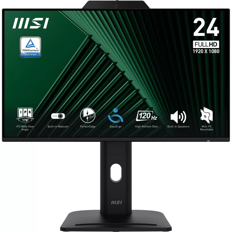- MSI PRO MP242PMG 23.8 INCH MONITOR, FHD (1920 X 1080), 120HZ, IPS, 1MS, 1X HDMI 1.4B, 1X DP 1.2A, 1X D-SUB(VGA), 2XUSB 5GBPS TYPE-A, 1X USB 5GBPS TYPE-B, BUILT-IN SPEAKERS, WEBCAM, ANTI-GLARE, ANTI-FLICKER, LESS BLUE LIGHT, T V CERTIFIED, VESA, KENSINGTON