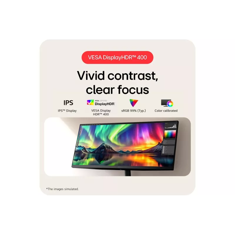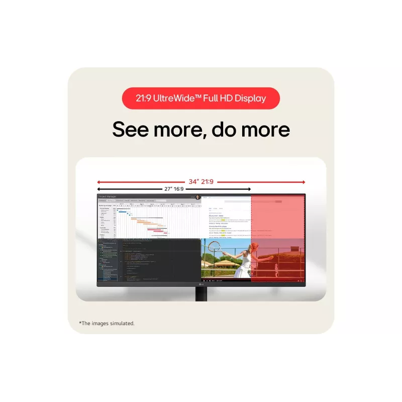 - LG 34U511A-B. DISPLAY DIAGONAL: 86.4 CM (34"), DISPLAY RESOLUTION: 2560 X 1080 PIXELS, HD TYPE: WFHD, DISPLAY TECHNOLOGY: LED, RESPONSE TIME: 1 MS, NATIVE ASPECT RATIO: 21:9, VIEWING ANGLE, HORIZONTAL: 178 , VIEWING ANGLE, VERTICAL: 178 . BUILT-IN USB HUB