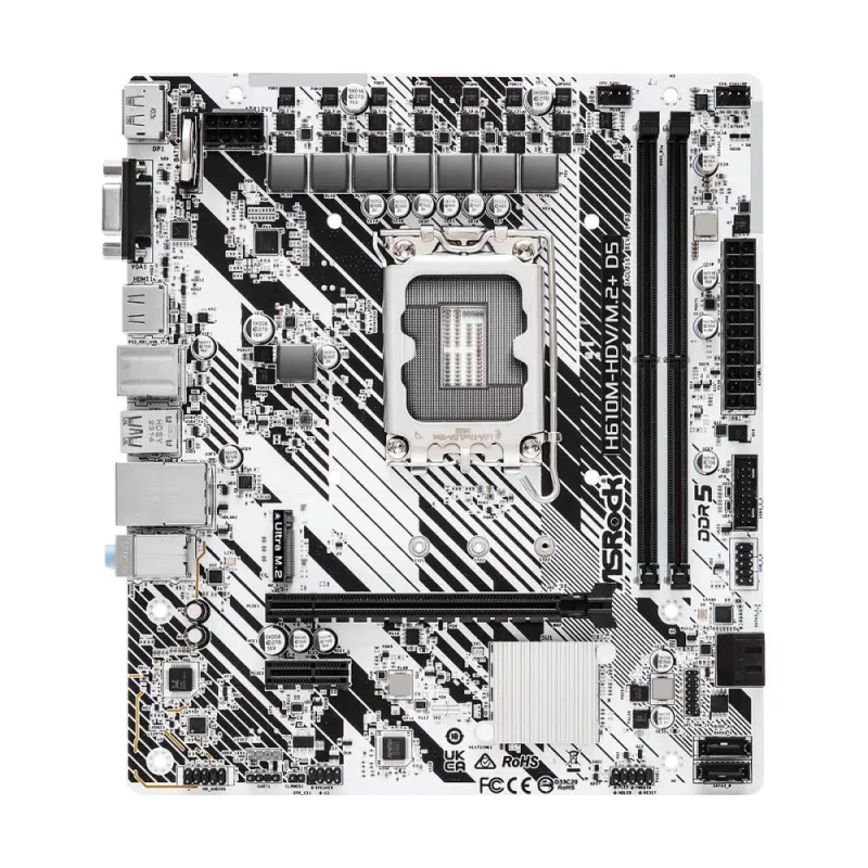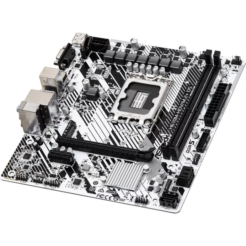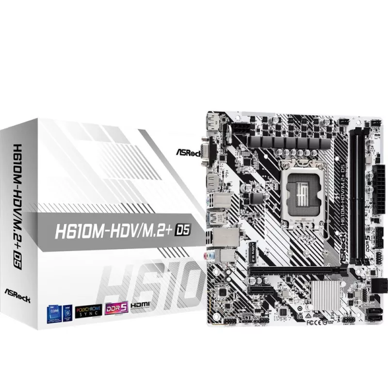 Intel H610 , LGA1700 , Micro-ATX , DDR5 , 5600/5500/5400/5333/5300/5200/5133/5100/5066/5000/4933/4866/4800 MHz , Memory slots 2 , Video Depending on CPU , LAN Gigabit , Audio Realtek ALC897 , TPM Header