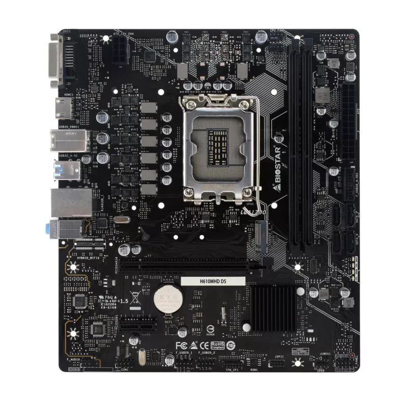 - BIOSTAR H610MHD D5. PROCESSOR MANUFACTURER: INTEL, PROCESSOR SOCKET: LGA 1700, COMPATIBLE PROCESSOR SERIES: INTEL CELERON , INTEL CORE I3 12TH GEN, INTEL CORE I3 13TH GEN, INTEL CORE I3 14TH GEN, INTEL.... SUPPORTED MEMORY TYPES: DDR5-SDRAM, MAXIMUM INTER