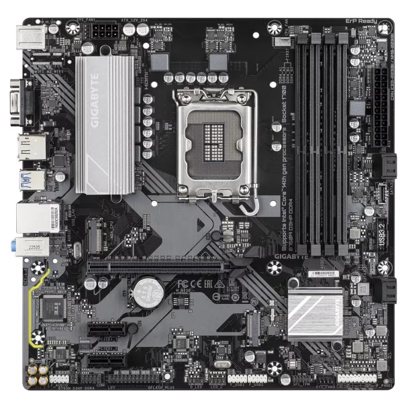 - GIGABYTE B760M D3HP DDR4 MOTHERBOARD - SUPPORTS INTEL CORE 14TH GEN CPUS, 4+1+1 PHASES DIGITAL VRM, UP TO 5333MHZ DDR4 (OC), 2XPCIE 4.0 M.2, GBE LAN, USB 3.2 GEN1. PROCESSOR MANUFACTURER: INTEL, PROCESSOR SOCKET: LGA 1700, COMPATIBLE PROCESSOR SERIES: INT
