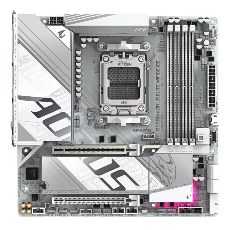 - GIGABYTE B850M AORUS ELITE WIFI6E ICE MOTHERBOARD- AMD RYZEN 9000 SERIES CPUS, 12+2+1 PHASES DIGITAL VRM, UP TO 8200MHZ DDR5 (OC), 1XPCIE 5.0 + 1XPCIE 4.0 M.2, 2.5LAN, WIFI 7, USB 3.2 GEN 2. PROCESSOR MANUFACTURER: AMD, PROCESSOR SOCKET: SOCKET AM5, COMPA