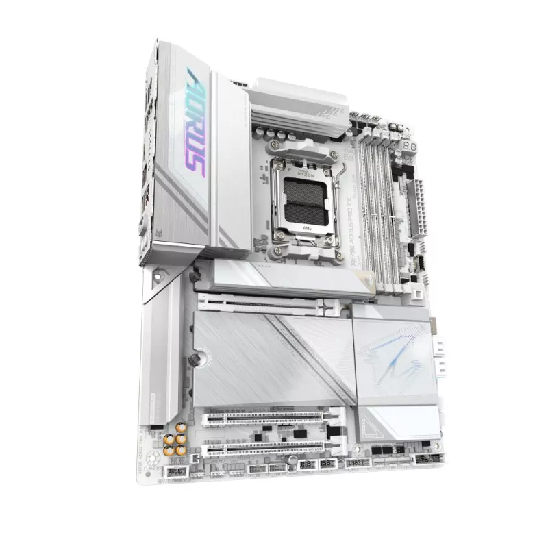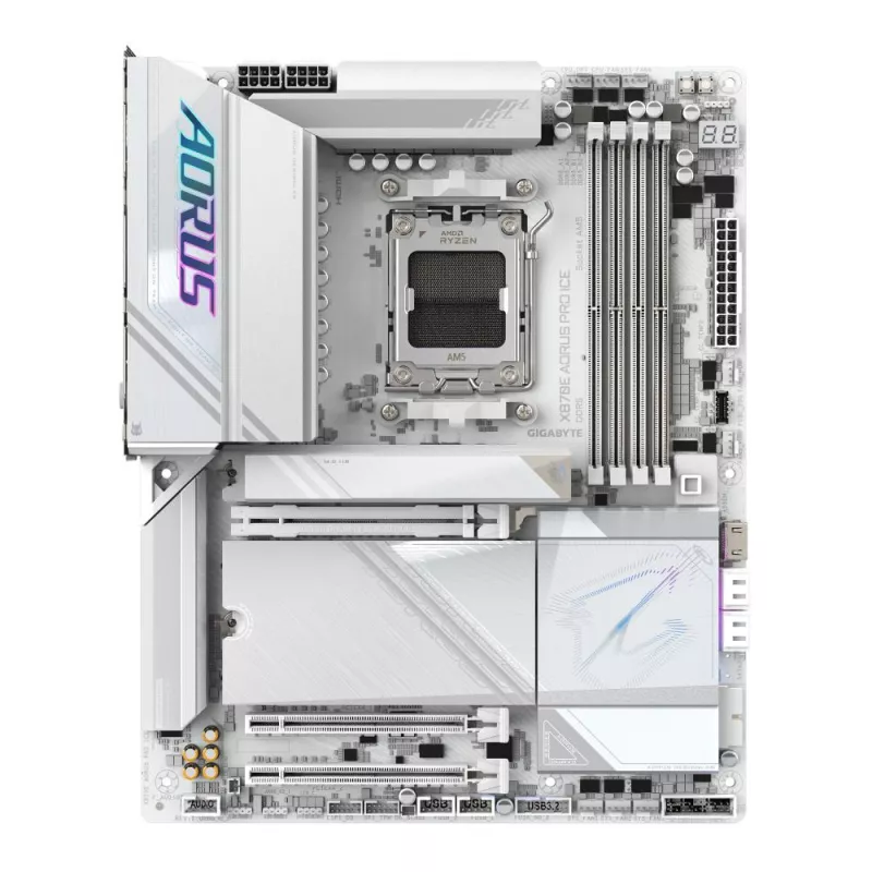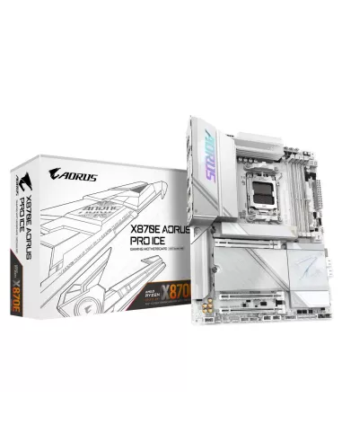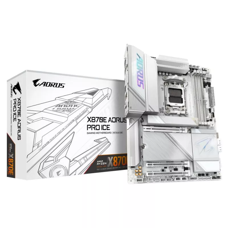 - GIGABYTE X870E AORUS PRO ICE MOTHERBOARD - SUPPORTS AMD RYZEN 9000 CPUS, 16+2+2 PHASES DIGITAL VRM, UP TO 8000MHZ DDR5 (OC), 3XPCIE 5.0 + 1XPCIE 4.0, WI-FI 7, 2.5GBE LAN, USB 4. PROCESSOR MANUFACTURER: AMD, PROCESSOR SOCKET: SOCKET AM5, COMPATIBLE PROCESS