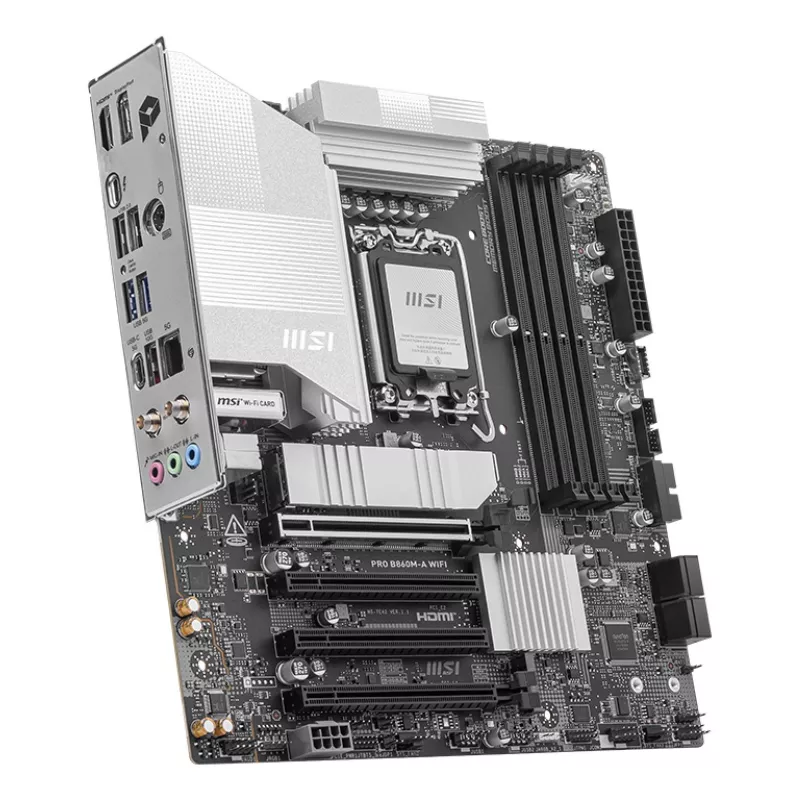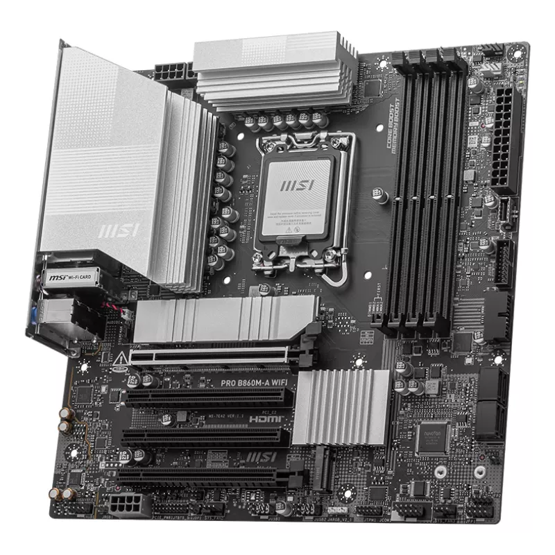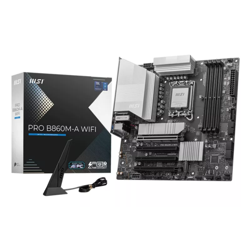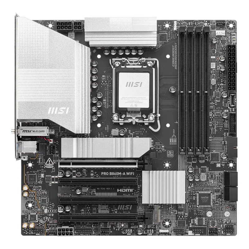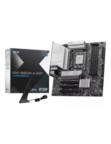 MSI PRO B860M-A WIFI. PROCESSOR MANUFACTURER: INTEL, PROCESSOR SOCKET: LGA 1851 (SOCKET V1), COMPATIBLE PROCESSOR SERIES: INTEL CORE ULTRA (SERIES 2). SUPPORTED MEMORY TYPES: DDR5-SDRAM, MAXIMUM INTERNAL MEMORY: 256 GB, MEMORY SLOTS TYPE: DIMM. SUPPORTED