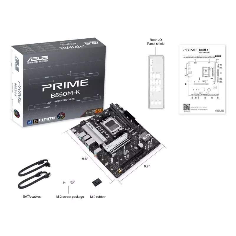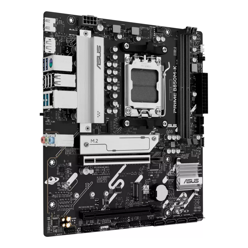 - ASUS PRIME B850M-K. PROCESSOR MANUFACTURER: AMD, PROCESSOR SOCKET: SOCKET AM5, COMPATIBLE PROCESSOR SERIES: AMD RYZEN 7000 SERIES, AMD RYZEN 8000 SERIES, AMD RYZEN 9000 SERIES. SUPPORTED MEMORY TYPES: DDR5-SDRAM, MAXIMUM INTERNAL MEMORY: 128 GB, MEMORY SL
