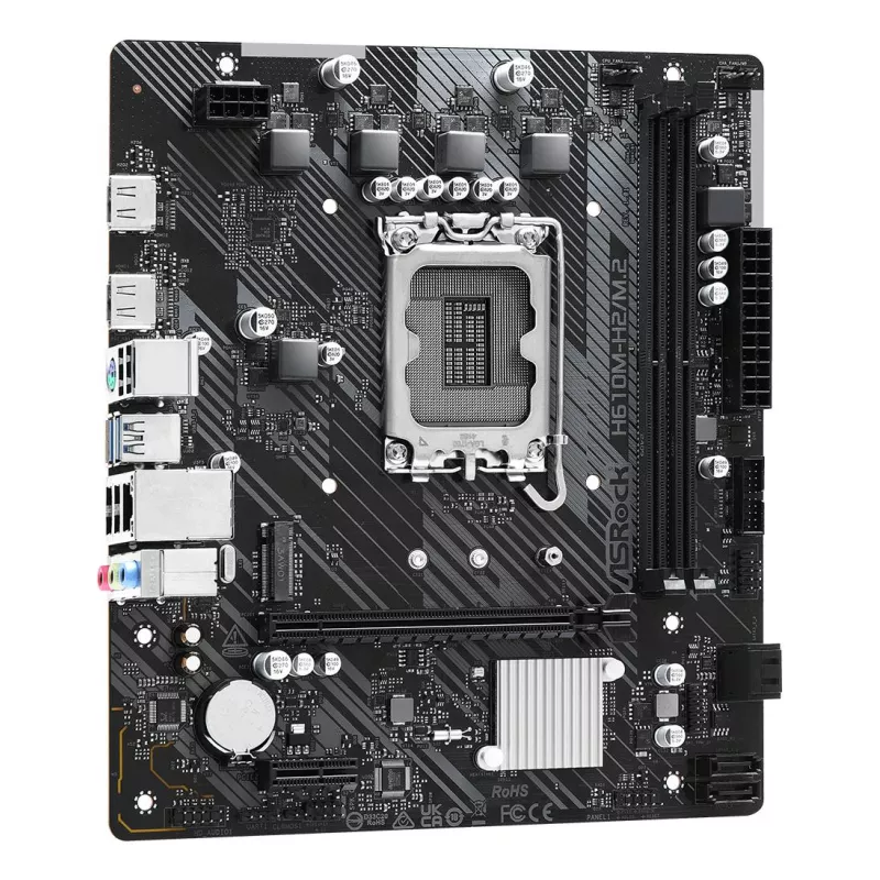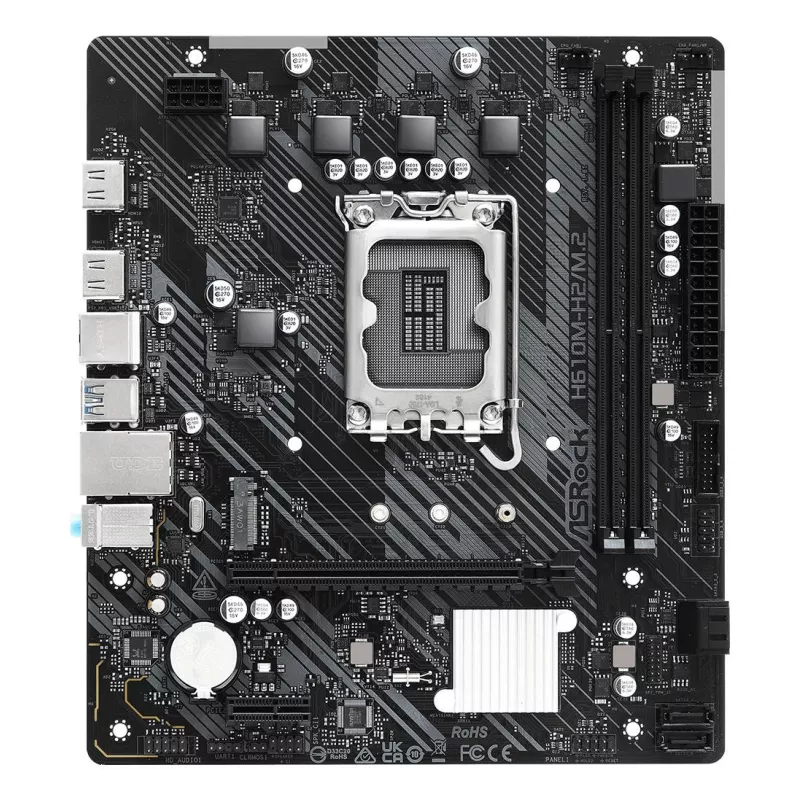 Intel H610 , micro ATX , Audio 7.1 channels , CPU Intel , Socket LGA 1700 , Series Intel Core i3 12th Gen/Intel Core i3 13th Gen/Intel Core i3 14th Gen/Intel Core i5 12th Gen/Intel Core i5 13th Gen/Intel Core i5 14th Gen/Intel Core i7 12th Gen/Intel Core i7 13th Gen/Intel Core i7 14th Gen/Intel Core i9 12th Gen/Intel Core i9 13th Gen/in , Supported memory types DDR4-SDRAM , 2xNumber of memory slots , Memory slots type DIMM , Supported storage drive interfaces M.2,SATA III , 4xUSB 2.0 ports quantity , 2xUSB 3.2 Gen 1 (3.1 Gen 1) Type-A ports quantity , 1xEthernet LAN (RJ-45) ports , 2xHDMI ports quantity