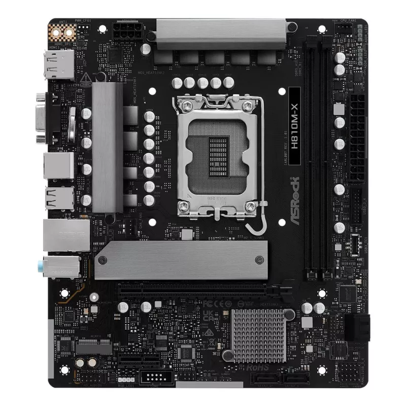 Intel H810 , micro ATX , Audio 7.1 channels , CPU Intel , Socket LGA 1851 (Socket V1) , Series Intel Core Ultra (Series 2) , Supported memory types DDR5-SDRAM , 2xNumber of memory slots , Memory slots type DIMM , Supported storage drive interfaces M.2,SATA III , 4xUSB 2.0 ports quantity , 2xUSB 3.2 Gen 1 (3.1 Gen 1) Type-A ports quantity , 1xEthernet LAN (RJ-45) ports , 1xVGA (D-Sub) ports quantity , 1xHDMI ports quantity