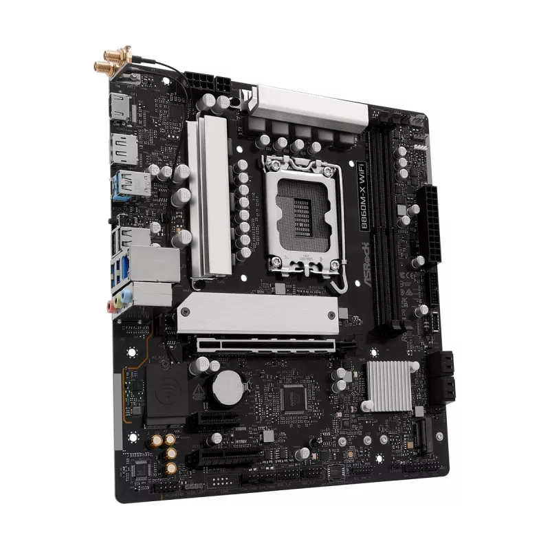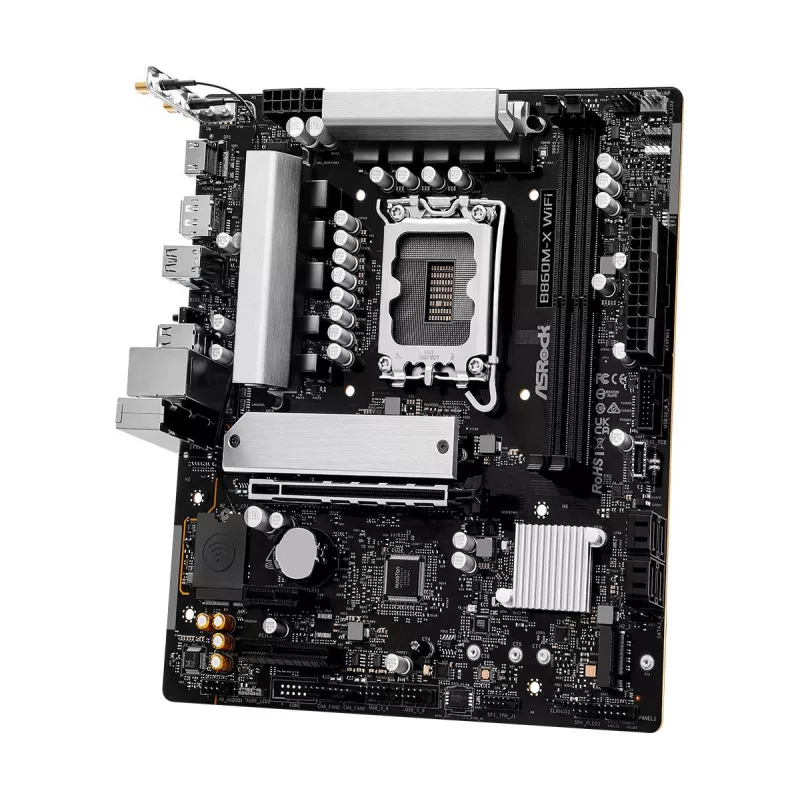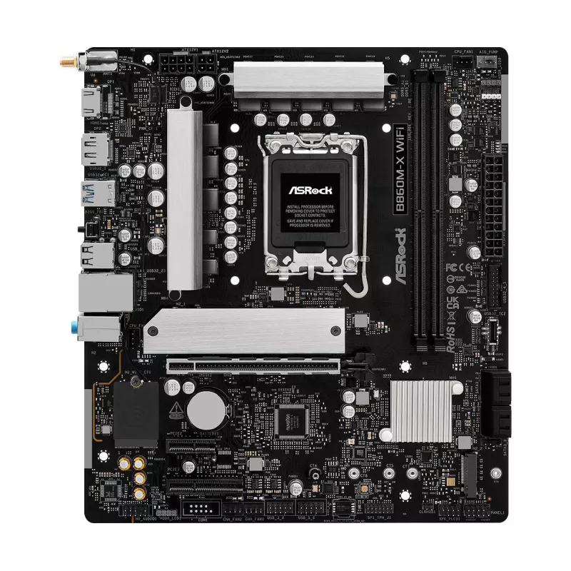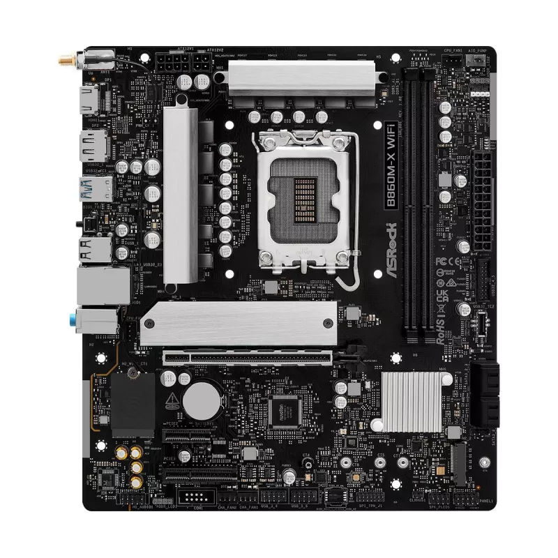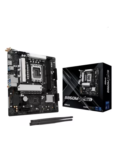 Intel B860 , micro ATX , Audio 7.1 channels , CPU Intel , Socket LGA 1851 (Socket V1) , Series Intel Core Ultra (Series 2) , Supported memory types DDR5-SDRAM , 2xNumber of memory slots , Memory slots type DIMM , Supported storage drive interfaces M.2,SATA III , On-board graphics card Yes , 2xUSB 2.0 ports quantity , 3xUSB 3.2 Gen 1 (3.1 Gen 1) Type-A ports quantity , 1xEthernet LAN (RJ-45) ports , 1xHDMI ports quantity , Wi-Fi Yes , Bluetooth Yes , Antenna included Yes