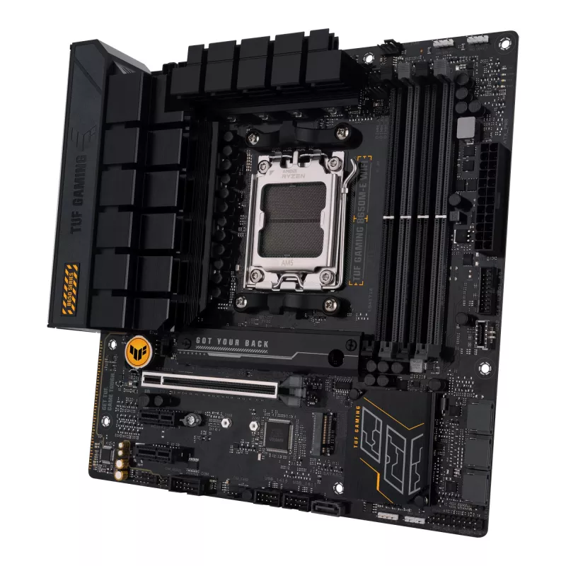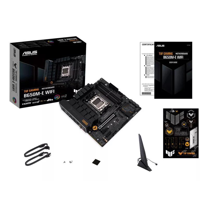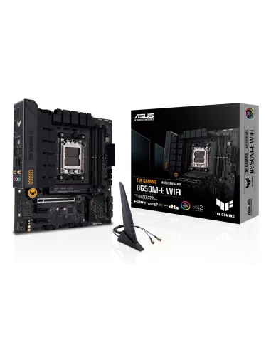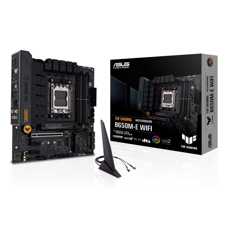 ASUS TUF GAMING B650M-E WIFI. PROCESSOR MANUFACTURER: AMD, PROCESSOR SOCKET: SOCKET AM5, COMPATIBLE PROCESSOR SERIES: AMD RYZEN 7000 SERIES. SUPPORTED MEMORY TYPES: DDR5-SDRAM, MAXIMUM INTERNAL MEMORY: 128 GB, MEMORY SLOTS TYPE: DIMM. SUPPORTED STORAGE DR