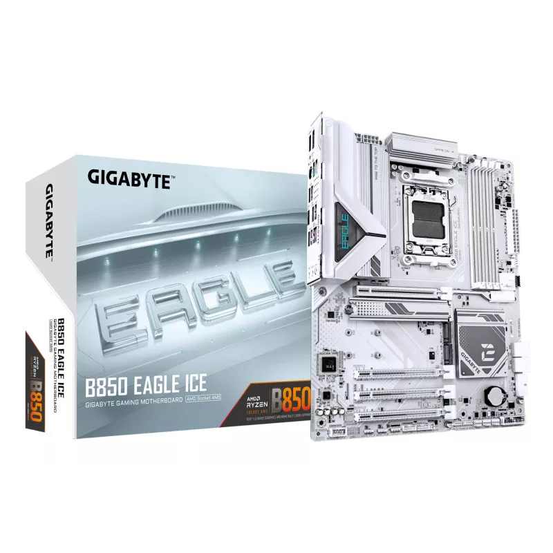 - GIGABYTE B850 EAGLE ICE MOTHERBOARD - AMD RYZEN 9000 SERIES CPUS, 8+2+2 PHASES DIGITAL VRM, UP TO 8200MHZ DDR5 (O.C), 1XPCIE 5.0 + 2XPCIE 4.0 M.2, 2.5 GBE LAN, USB 3.2 GEN 2. PROCESSOR MANUFACTURER: AMD, PROCESSOR SOCKET: SOCKET AM5, COMPATIBLE PROCESSOR