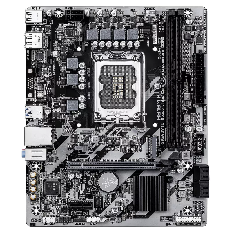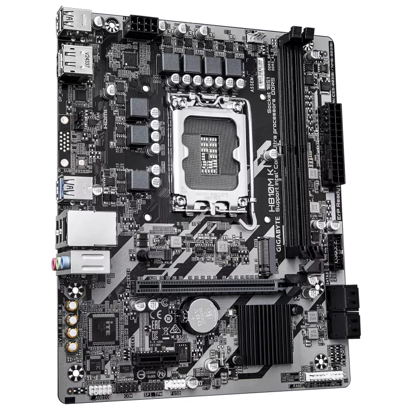 GIGABYTE H810M K MOTHERBOARD - INTEL CORE ULTRA (SERIES 2) CPUS, 3+1+2 PHASES VRM, UP TO 6400MHZ DDR5, 1XPCIE 4.0 M.2, 1GBE LAN, USB 3.2 GEN 1. PROCESSOR MANUFACTURER: INTEL, PROCESSOR SOCKET: LGA 1851 (SOCKET V1), COMPATIBLE PROCESSOR SERIES: INTEL CORE