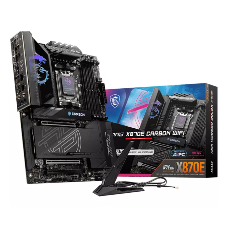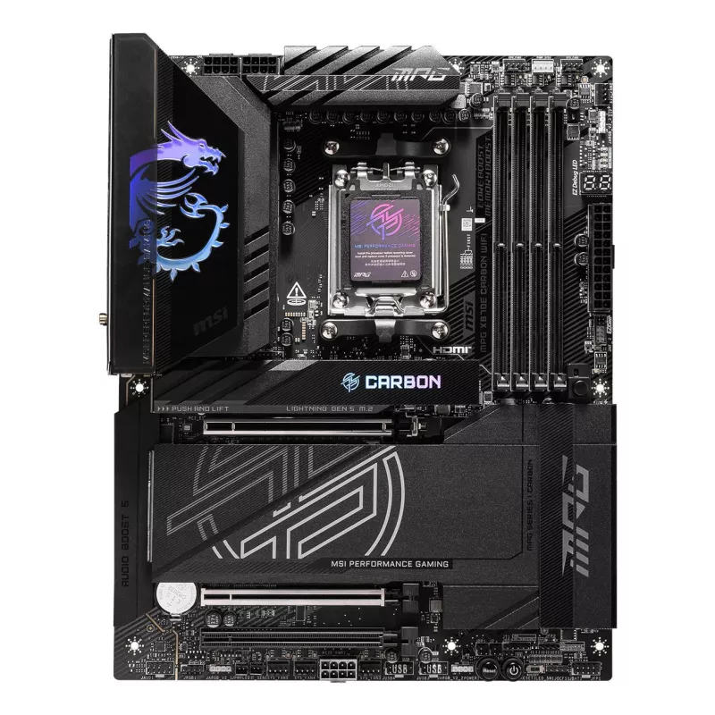 MSI MPG X870E CARBON WIFI. PROCESSOR MANUFACTURER: AMD, PROCESSOR SOCKET: SOCKET AM5, COMPATIBLE PROCESSOR SERIES: AMD RYZEN 7. SUPPORTED MEMORY TYPES: DDR5-SDRAM, MAXIMUM INTERNAL MEMORY: 256 GB, MEMORY SLOTS TYPE: DIMM. SUPPORTED STORAGE DRIVE INTERFACE